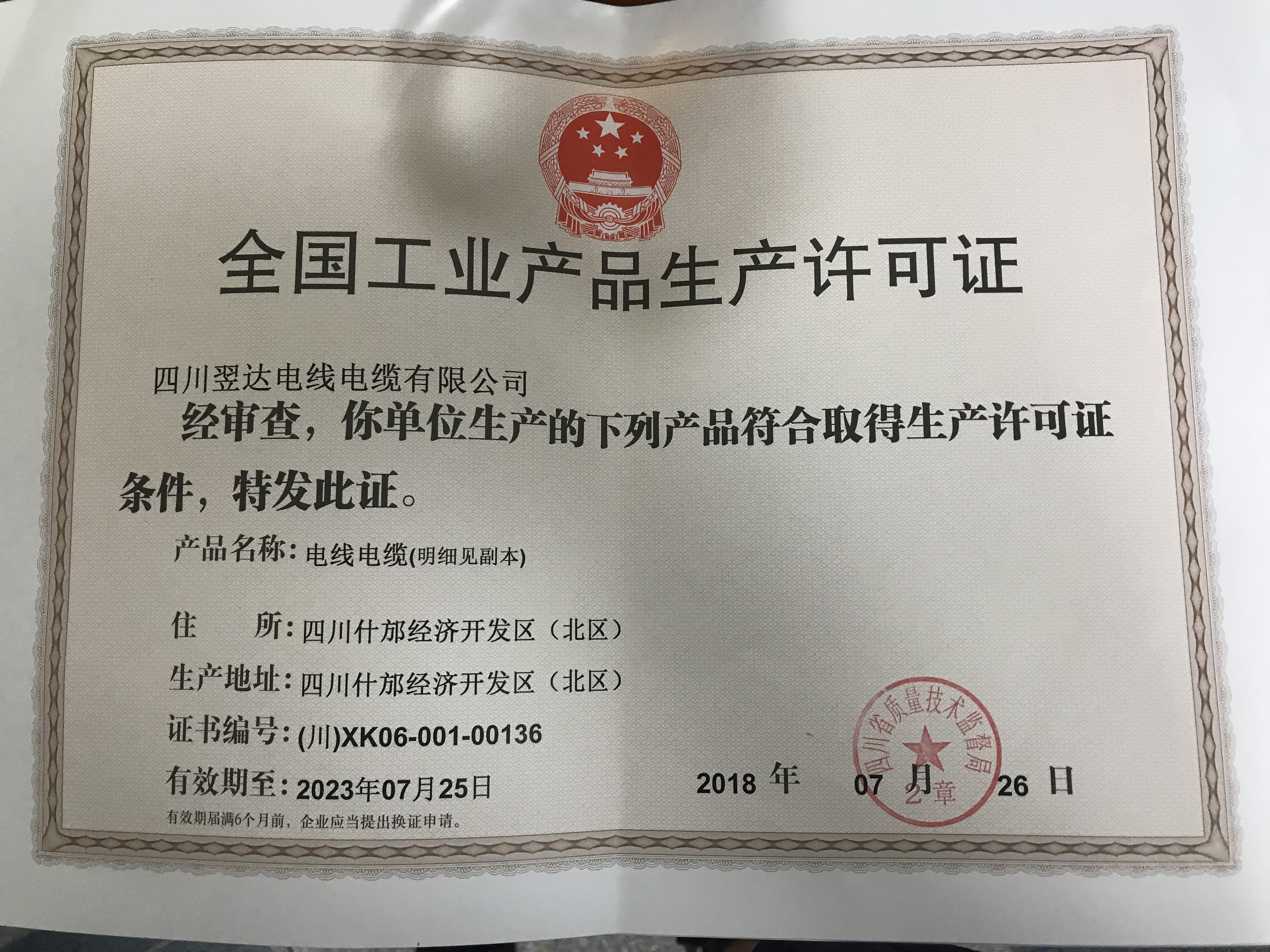 热烈祝贺四川翌达电线电缆有限公司取得生产许可证